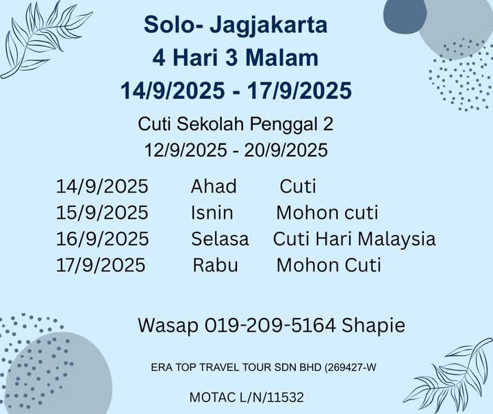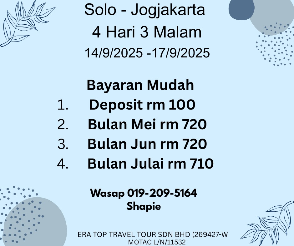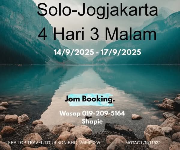 Sila lock tarikh ini untuk ke Solo-Jogjakarta-Pantai Timang. Sila wasap untuk lock tarikh www.wasap.my/60192095164/JogjakartaSOLOwebsite