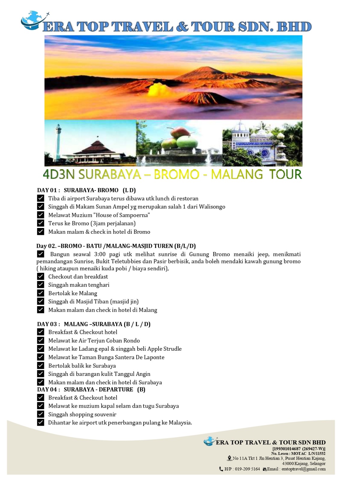 Jom Melancong Ke Surabaya- Bromo- Malang Tour 4 Hari 3 Malam wasap sekarang.